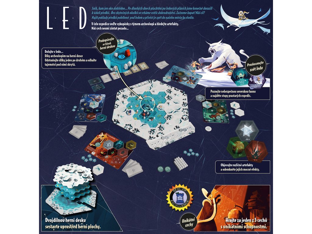 L E D je strategická hra o průzkumu zamrzlého údolí, kde jako členové archeologických cechů odkrýváte vrstvy ledu a hledáte dávné artefakty. Postupně sestupujete hlouběji do ledovce, plníte zakázky města a snažíte se získat co největší uznání za své objevy.