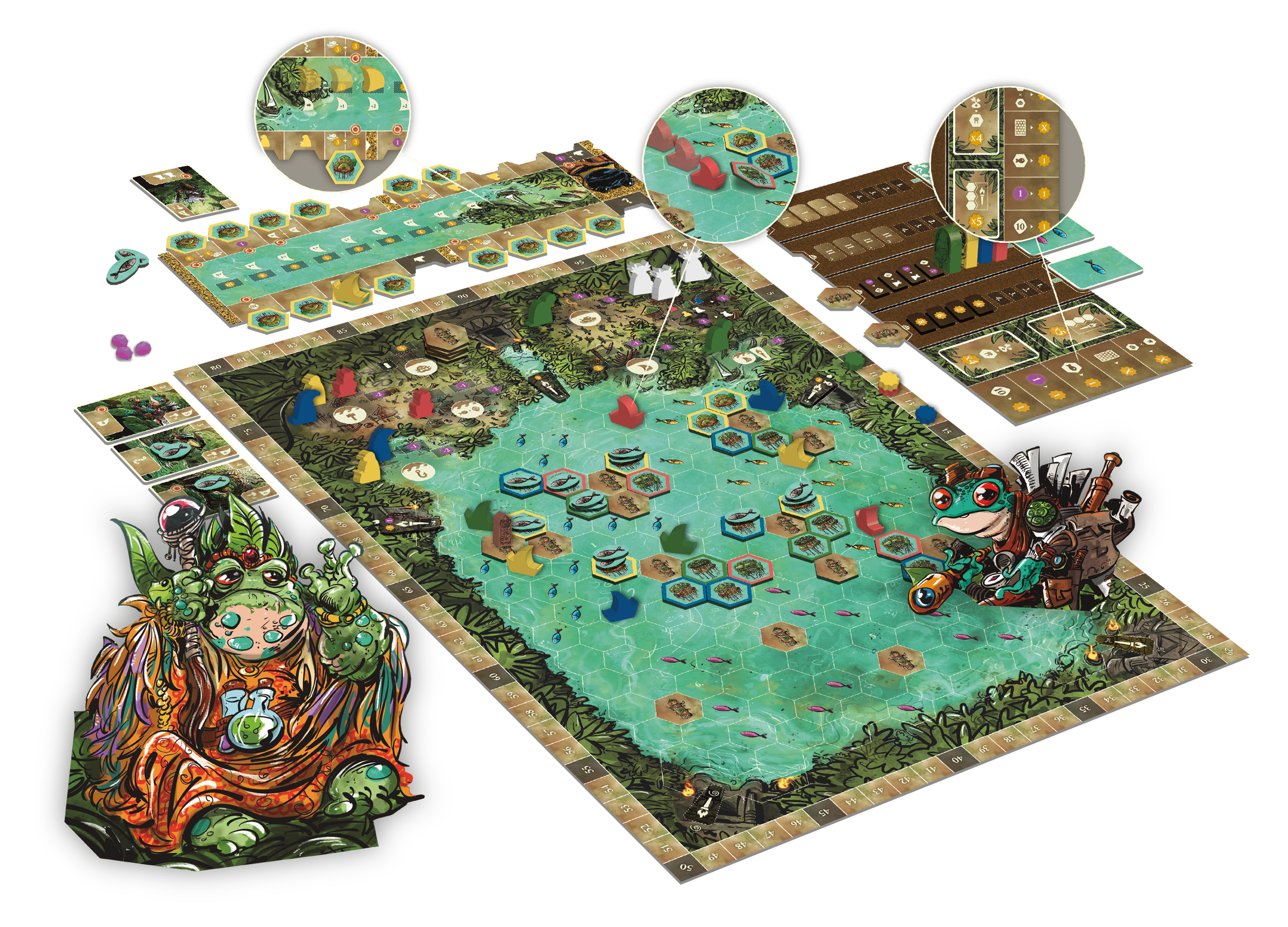 V Posvátné bažině zakládají klany nové osady, plují mezi ostrovy a snaží se získat co nejvíce vítězných bodů. Herní plán tvoří síť ostrovů se svatyněmi, které ovlivňují bodování a vytvářejí přirozená centra zájmu.