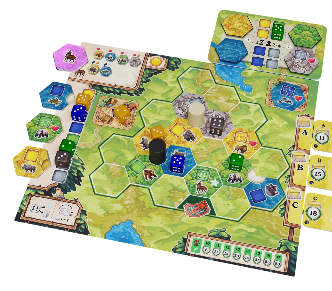 Rodinná strategická hra, ve které kombinujete výběr kostek a skládání stanovišť, abyste vybudovali co nejlépe fungující rezervaci pro různé druhy zvířat.